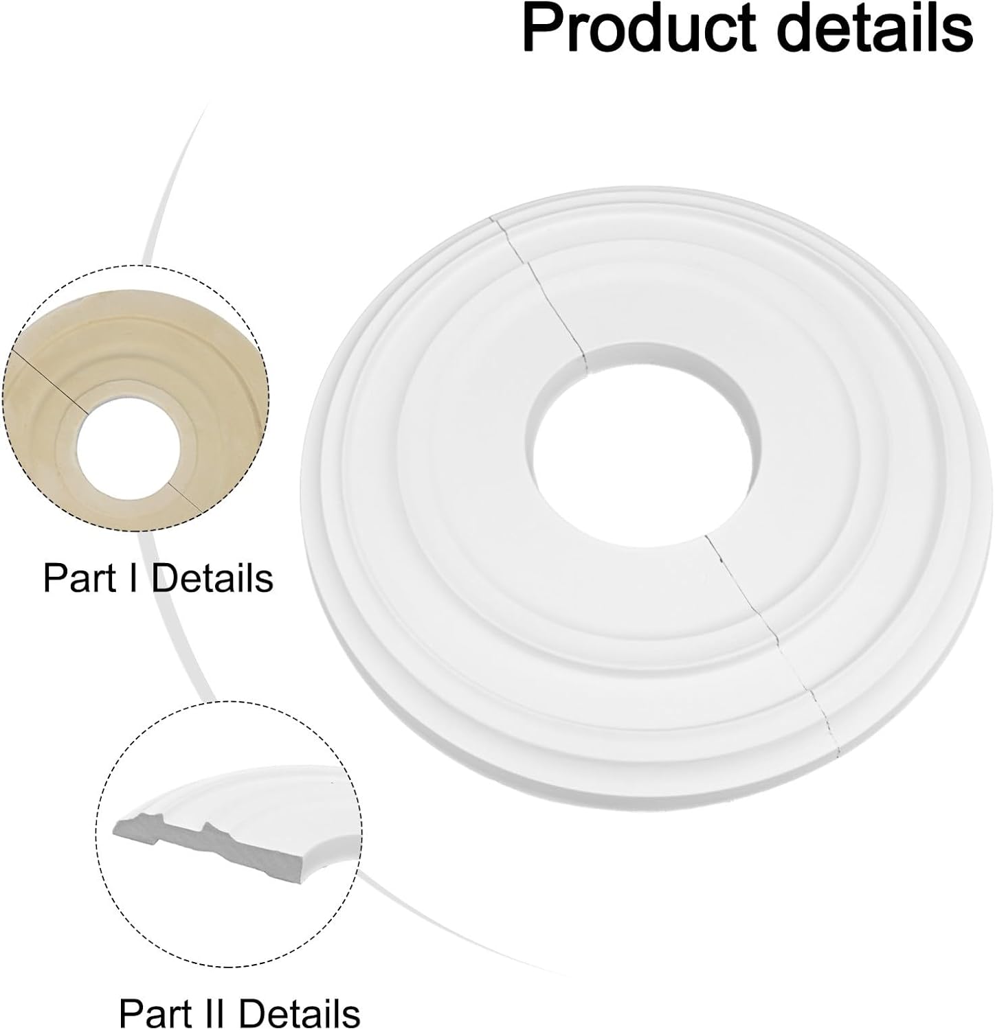 Features:*Split Molded PU Ceiling Medallion: This ceiling medallion is made of molded polyurethane (PU) and measures 12 inches in outer diameter and 4 inches in inner diameter. It provides an elegant and charming background for ceiling fans and light fixtures.*Easy to install: Lightweight, this dent-resistant and ceiling medallion is easy to install. It is suitable for most ceiling lamps and ceiling fans, adding a touch of style to your space.*Lightweight and simple design: With its lightweight design, this ceiling medallion is easy to handle and install. Its ensures long-lasting style and allows for pairing with other decor to enhance the room's architectural interest.*Multi-purpose usage: In addition to enhancing the appearance of the ceiling, this medallion can also cover redundant holes or cracks. It serves multiple purposes and adds elegance to your ceiling fan and lamps.*Safe and reliable material: Made of PU material, this ceiling molding medallion is safe, reliable, and resistant to breakage. It ensures a safe addition to your ceiling decor.Specifications:*Product Name:Ceiling Medallion*Material:PU*Size:12 inches in outer diameter and 4 inches in inner diameter*Color:WhitePackage Content:1 x Ceiling MedallionNote:1. The real color of the item may be slightly different from the pictures shown on website caused by many factors such as brightness of yourand light brightness.2. Please allow slight manual measurement deviation for the data.