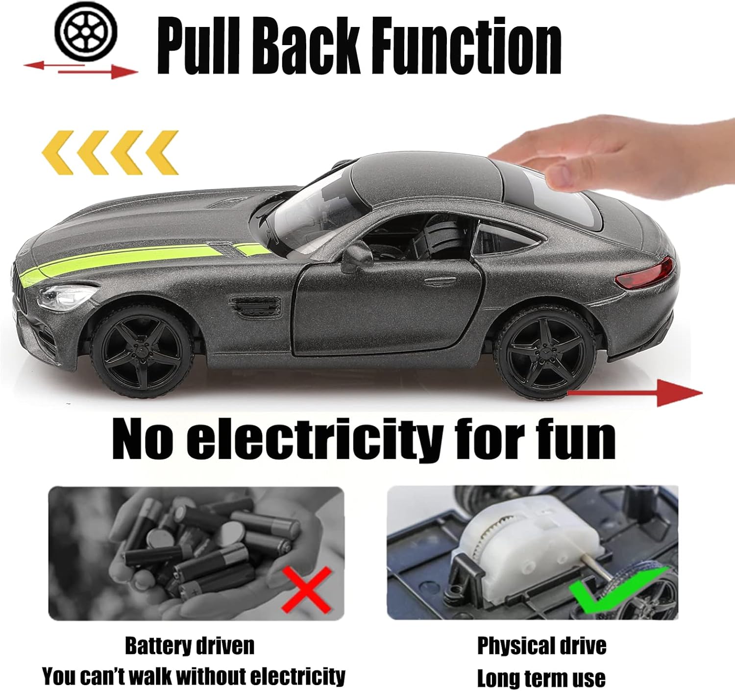 TOKAXI Die-cast model cars are made of high-quality alloy materials and are miniature replicas of real cars. These car toys are small enough for kids' hands to handle, made cutely and easy to control. They're very handy to carry wherever you go. This car doesn't require batteries- just pull it back and watch it go! This is a great way to help children exercise their hand-eye coordination and reaction speed. The car door is designed to open separately, making it easy for children to learn about cars. The realistic interior decoration is also enjoyable and educational. You can use it as an ornament in your home or put it on your car to show your appreciation for art. This pull-back car is not just a toy for kids but also a nice addition to enthusiasts' car model collection. We have a wide selection of cars to choose from, so you can find the perfect one for your collection from our products. All of TOKAXI die-cast model cars are attractively packaged in English, making them the perfect Christmas, Birthday, Children's Day, New Year gift for kids, party favors, home decorations, or travel toys for boys and girls.