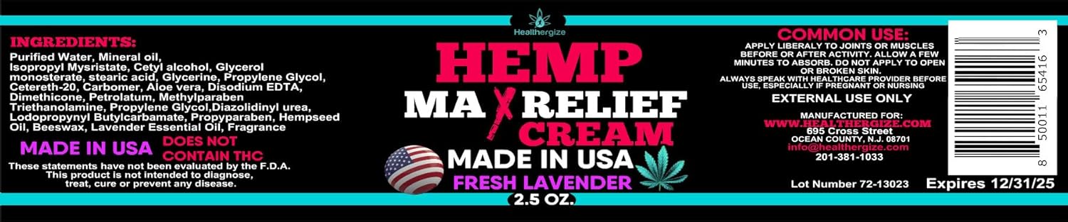 Healthergize cream brings the greatest and quality ingredients. Extra ingredients like Turmeric and Hemp helping with discomfort and similar issues. Can also be used as a great moisturizer for itchy or dry skin. Works great on insect bites and stings. Made with a pleasant lavender aroma, this cream is ultra absorbing and works on instant contact.