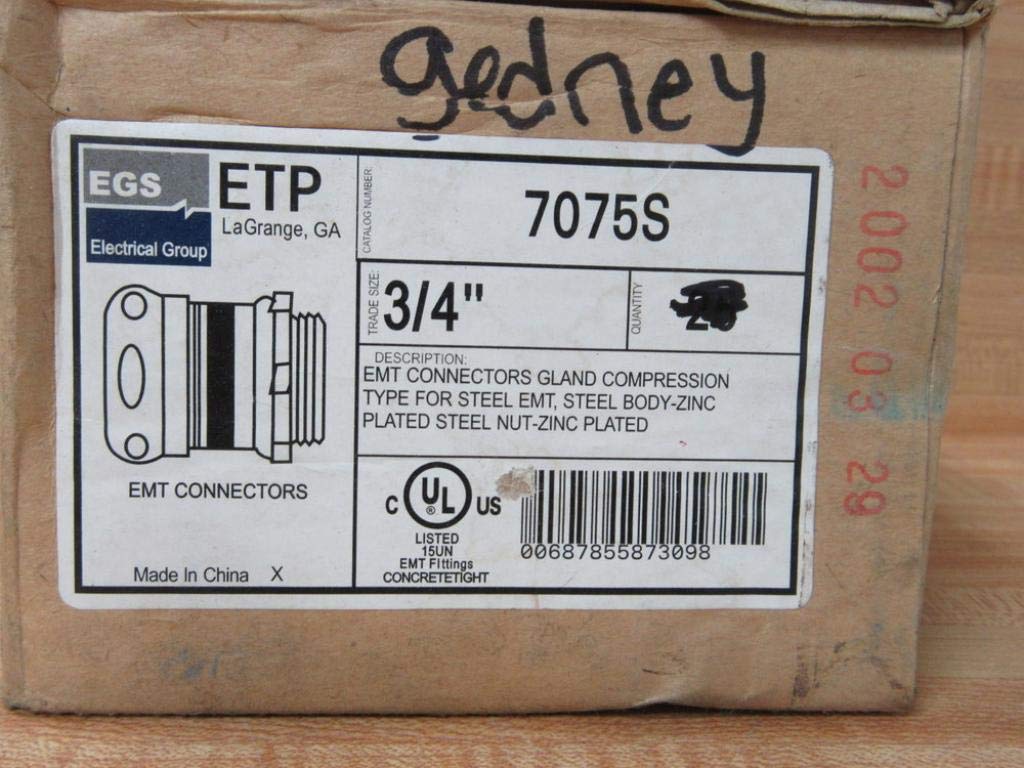 PN: 7075S OZ Gedney EMT Connectors Gland Compression Type For Steel EMT +In Wet Locations Use A UL Listed O-Ring Between Box And Fitting Size 3/4" Steel Zinc Plated Cross Reference Manufacturer - Part Number AMFI - EC751 AFC - CC75 Appleton - TW75CS Bridgeport - 251 Crouse Hinds - 651S Madison - MEC751 Regal - 7602 Raco - 2903 Steel City - TC112SC T&B - 5221 Topaz - 652S EGS Electrical Group
