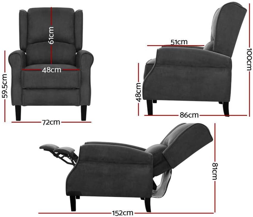 Own your comfort with the Artiss Recliner Chair, a perfect blend of style and functionality that elevates your home experience. Enjoy the gold class movie experience in your own home with this luxurious recliner chair, upholstered in smooth and premium fabric. The richly padded high-resilience foam offers exceptional comfort, making it an ideal addition to your lounge sofa or living room setup. This versatile recliner chair serves as both a sofa chair and a recliner sofa, allowing you to adjust the backrest and footrest to your preferred angle for ultimate relaxation. With a large backrest providing full head and back support, you can easily sit back and unwind, whether you're watching television, playing video games, or enjoying music. The sturdy contoured seating is backed by a solid steel base, ensuring durability and stability for all users. Perfect for any room, this adjustable reclining chair fits seamlessly into your study, media room, or even as a nursing chair recliner. Its ergonomic design makes it suitable for everyone, from gaming enthusiasts to those looking for a comfortable office recliner. With a sleek charcoal finish, the Artiss Recliner Chair is not just a recliner armchair; it's an essential piece of furniture for your home theatre seating or cinema lounge. Experience the joy of reclining in style with this premium recliner, designed for both leisure and support. Features - Premium suede fabric - High-resilience foam padding - Large backrest - Sturdy contoured seating - Adjustable back and leg rest - 111°-148° adjustable range - Sturdy steel base - Comfortable armrests - Solid wood legs - SGS-tested reclining mechanism - SAA-approved Specifications - Cover: Suede fabric - Filling: Foam - Overall dimensions: 72cm x 86cm x 100cm - Unfolded length: 152cm - Weight capacity: 150kg - Colour: Charcoal Package Content - Artiss Recliner Chair x1 - Assembly manual x1 This product comes with a 1-year warranty.