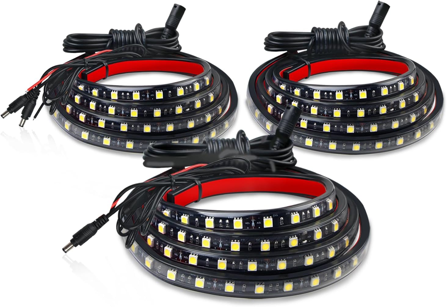Avenemark 3PCS 60 Inch LED Truck Bed Light Strip Each piece of truck bed light strip outputs super bright white light with 90PCS 5050-SMD LED chips, the LED lumen is 20-22LM per LED. It has IP67 sealed housing that can well protects LED strips against rain drops, snow and being super durable and flexible. It comes with extension wire that can pretty assure that you will never be short of wire length. It's operating voltage is 12V DC. Package includes: 3x LED light strip with wire bundle 1x on/off switch blade fuse wire bundle 1x Extension wire to power source 1x Hardware pack 1x User manual