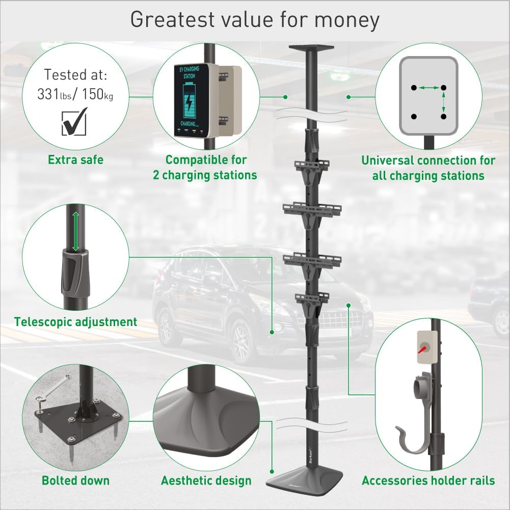 TheBarkan 137" Universal EV Charging Station Column 5-Year Warranty (scroll down for document). Elegant Ceiling-Floor Solution: A sleek and accessible option for installing electric vehicle charging stations, without the need for custom fabrication or welding. Affordable pricing and immediate availability. Designed for Covered parking lot: Ideal for installing up to 2 charging stations when wall mounting isn't feasible, with electrical feed coming from the ceiling. Supports up to 110 lbs (50 kg): Passed safety testing for loads up to 330 lbs (150 kg). Modular Rails: Adjustable mounting for charging stations and accessories (cable hooks, electric switches, charging cable holders) at various heights for ergonomic ease. Clean Cable Management: Power cables are concealed within the pole, entering through a side opening near the ceiling for a neat and aesthetic look. Comes with Premium Hardware: Includes Barkan brand screws and anchors for mounting to both ceiling and floor concrete surfaces. Height: Adjustable between 95-137 inches (240-350 cm). Installation: Wiring and station setup must be performed by a certified electrician according to the installation instructions. For assistance, please contact support.
