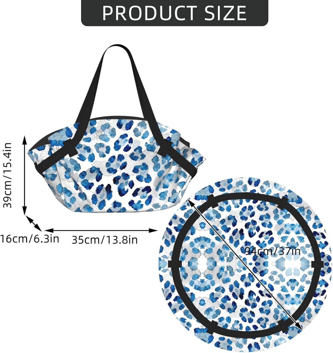 Packing for a picnic means hauling a separate blanket and a bulky bag. This Blue leopard print foldable camping tote solves that with one brilliant design. It starts as a spacious 78-inch round picnic blanket, big enough for two adults. The circular shape naturally brings people together-perfect for couples, friends, or family time. Spread it on the beach, at the park, or campsite for an instant cozy oasis. When ready to pack up, it transforms into a large portable tote in seconds. Fold it, snap the built-in buttons, and use the handles to carry everything-blanket, snacks, drinks, and gear-all in one bag. The thick, waterproof fabric stands up to grass, sand, and rough ground while keeping you dry. Spills wipe right off. Two patch pockets keep essentials organized-phone, keys, wallet, sunscreen. Perfect for beach days, park picnics, outdoor concerts, or camping trips. Lightweight and portable, it folds compactly for storage. A brilliant gift for outdoor enthusiasts. One product, endless possibilities.