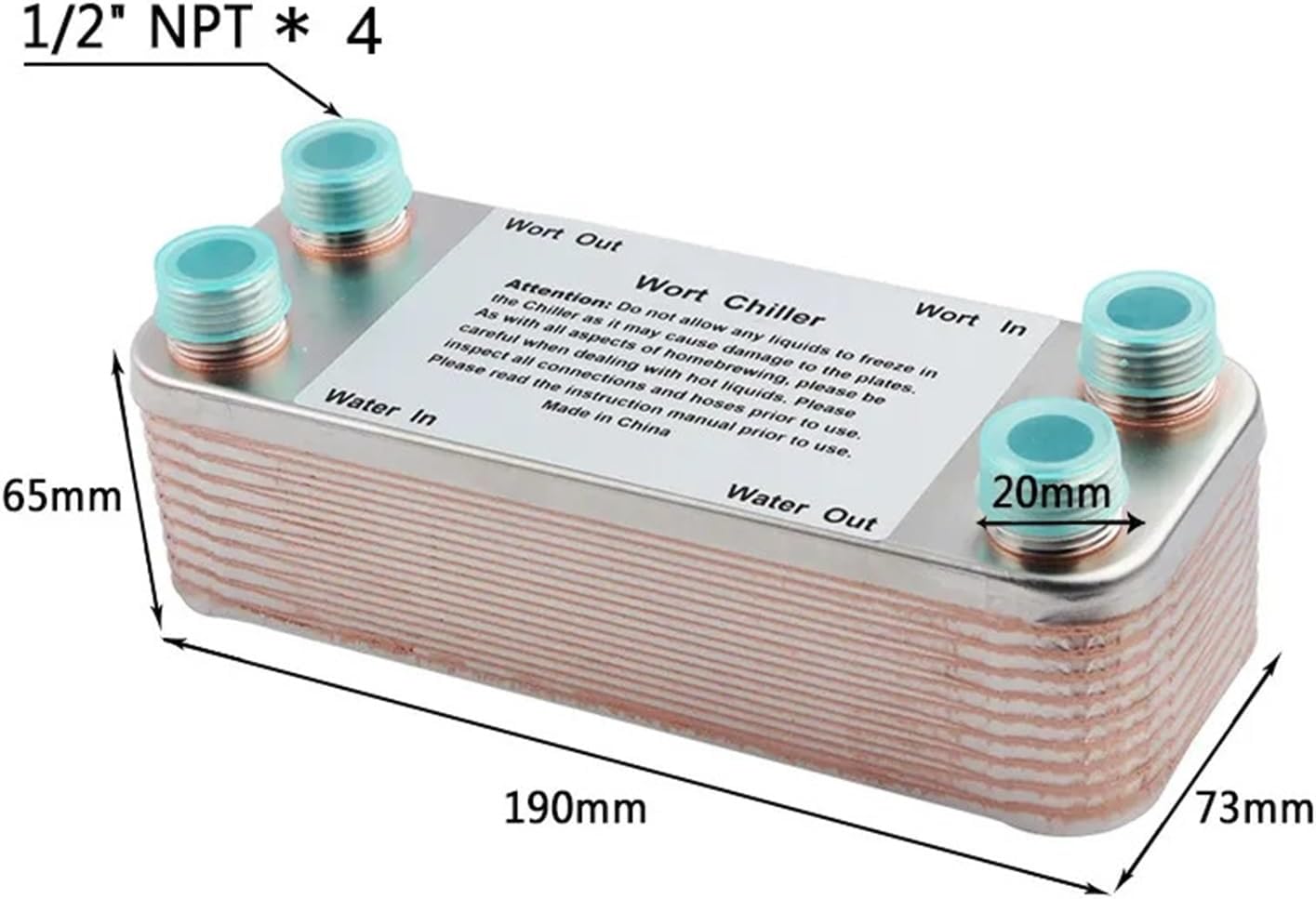 20 Plate Wort Chiller Draft Beer Homebrew Chiller Stainless Stee 304 Heat ExchangerThe stainless steel wort plate chiller is a highly-efficient device. This chiller is made of 20 plates of 304 stainless steel that have been brazed together with pure copper in an oxygen-free furnace.Heat Transfer Area/plate: 0.012m2(0.14ft2)Thickness of plates: 0.3 mm(0.0118")Max Flow Rate: 66.6L/min(17.6gpm)Design Pressure:1.0 Mpa(145 psi)Test Pressure: 2.0 Mpa(290 psi)Refrigeration Capacity: 1-5 KW(3400-17000 BTU/hour)Package Includes:1 x 20plateWort Chiller