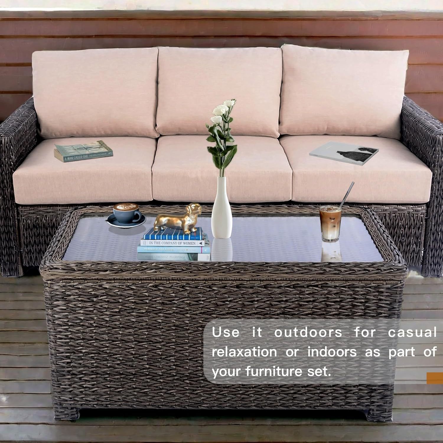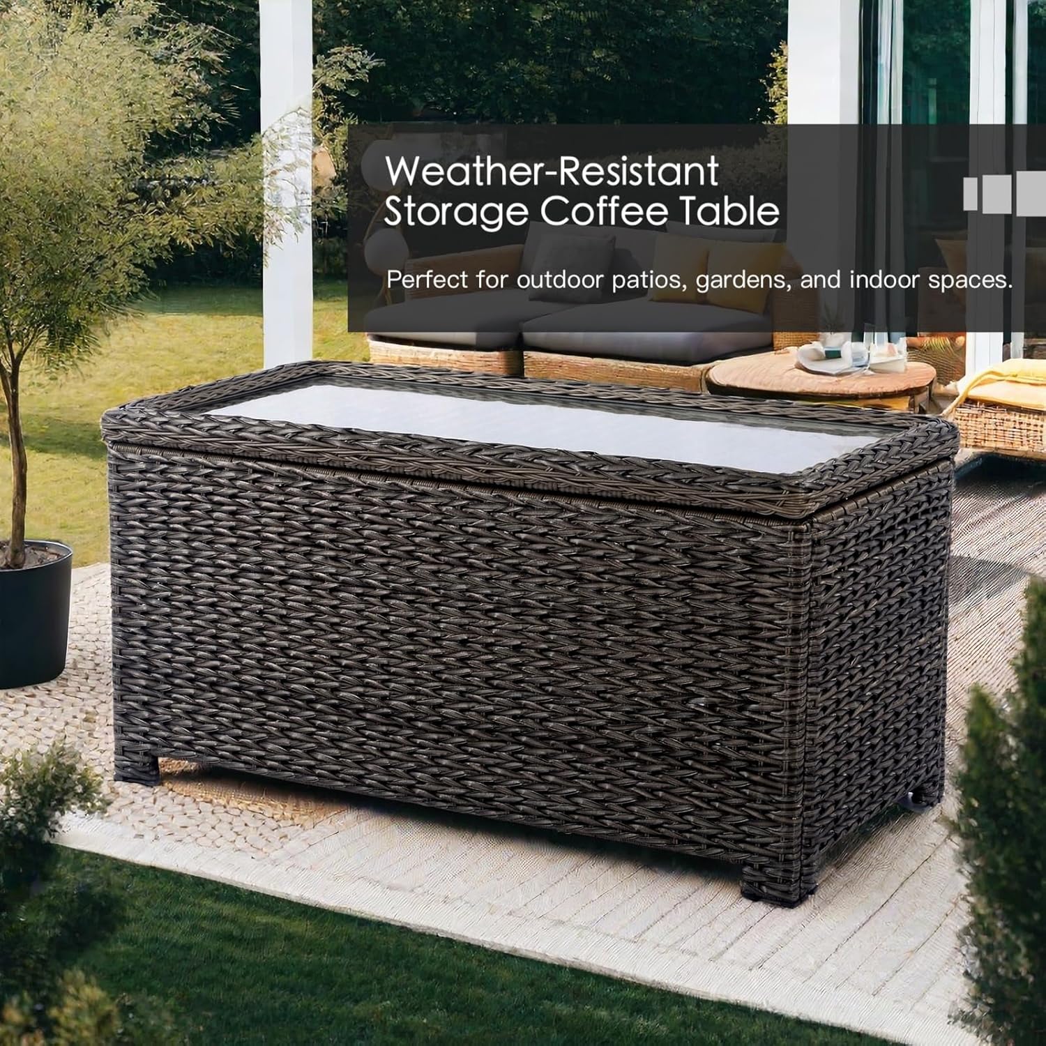 Upgrade your living space with this classic wicker coffee table, combining timeless style and practical storage. Crafted from durable HDPE rattan with a tempered glass flip-top, it’s designed to resist cracking, fading, and moisture, making it ideal for indoor and outdoor use. The hidden storage compartment provides space for cushions, books, or accessories, keeping your space tidy and organized. Measuring 40”W x 19”D x 22”H, it offers ample surface area and supports up to 200 lbs. Easy to assemble in just 15 minutes, this table is perfect for patios, living rooms, or backyard gatherings, and it’s backed by a 2-year warranty for worry-free enjoyment.