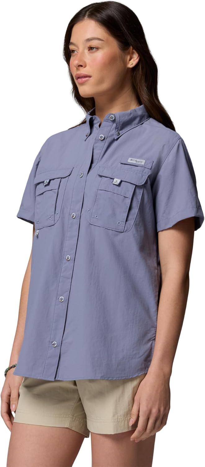 A sun-blocking, quick-drying Columbia PFG women’s shirt for fishing and enjoying the great outdoors. This short-sleeve layer offers cooling vents, multiple pockets, and a rod holder. Columbia offers this shirt in multiple colors and sizes. Extended sizing available. Relaxed fit.