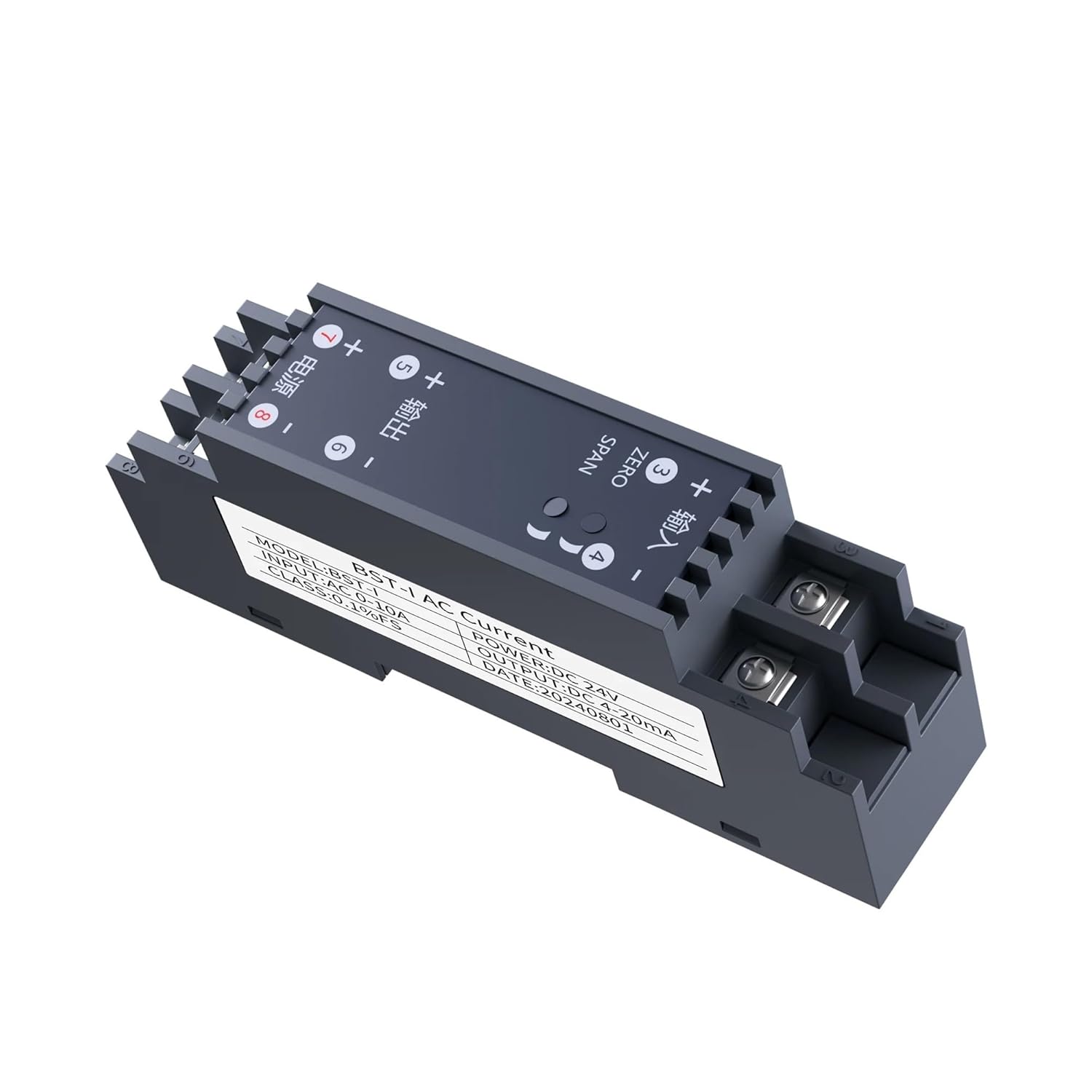 <;1>. BST-I AC current transmitter, it converts AC signals from AC into standard process signals.<;2>. It is used for DCS to centrally monitor the motor,pump and heat supply network,monitor the power supply line and its current.<;3>. Standard 35mm DIN rail independent mounting.Full channel configuration,Parameter customizable.Technical ParametersInputInput Current RangeAC 0-20A;CustomizedOutputOutput Signal4-20mA;0-20mA;0-10mA;0-5V;0-10V;1-5V;CustomizedOutput Load ResistanceRL500(output current signal)RL10K(output voltage signal)Other ParametersPower SupplyDC24V,±10%Accuracy0.2%F.S.Respond Time400mS(0-90%) (TYP)Rated Power Consumption1W(1 in 1 out,DC24V power supply,output 20mA)Isolation Intensity2000V AC/1min(between input-ouput-power)Insulation Resistance100M(between input-ouput-power)Supply Voltage : DC24VAccuracy Class : 0.5%Model Number : BST-IDisplay Type : Analog OnlyDIY Supplies : ElectricalInput current range : AC 0-20AOutput signal : 4-20mA;0-20mA;0-5V;0-10VResponse time : 400mS(0-90%)(YTP)Installation method : Din rail