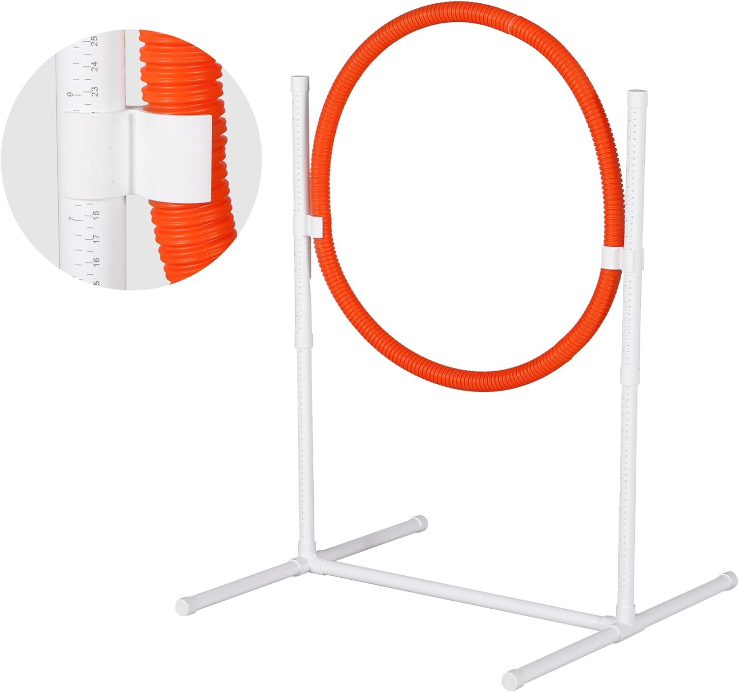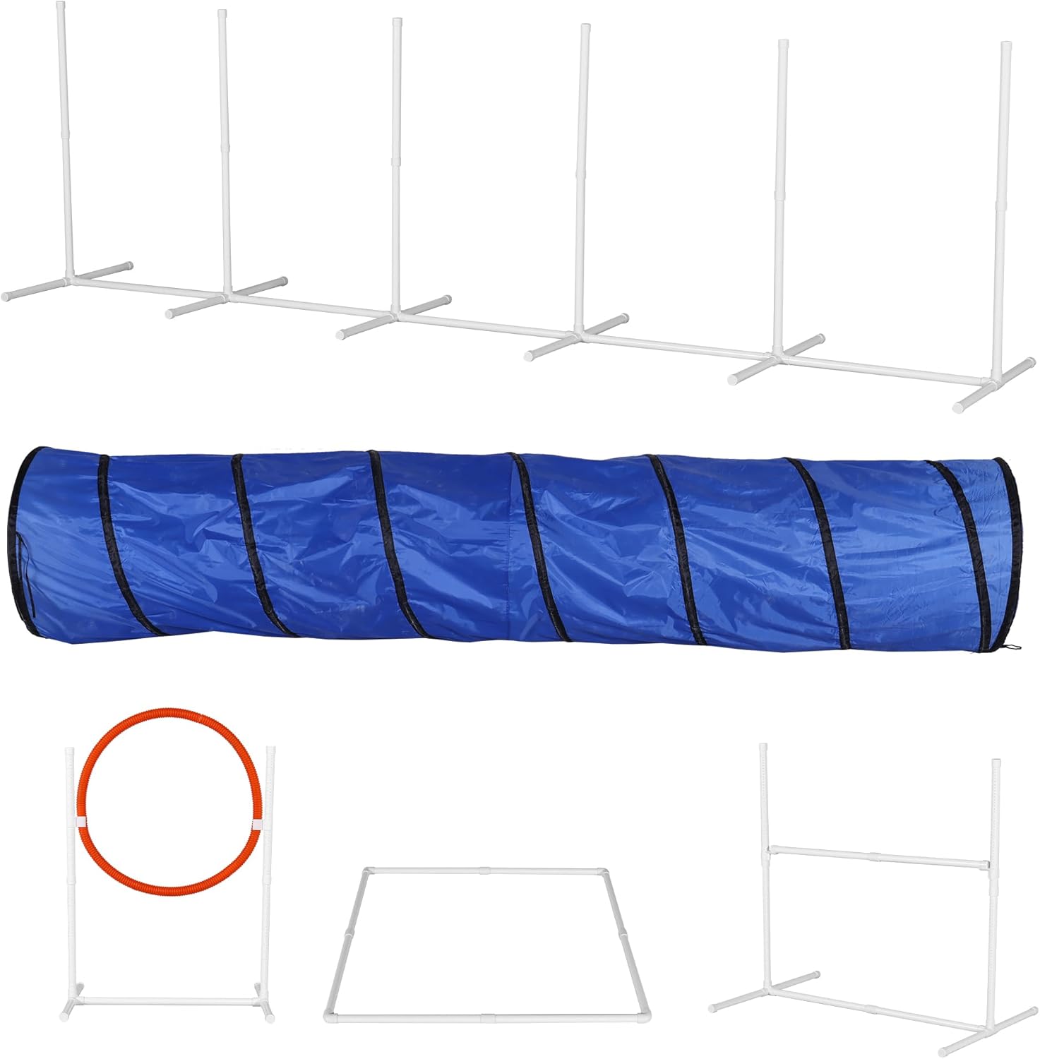 ** 6-Pack Dog Agility Training Equipment Set **Place of Origin:** China **Main Color:** White **Main Material:** Plastic **Product Dimensions:** - Assembled Length (in.): 131.50 - Assembled Width (in.): 26.00 - Assembled Height (in.): 36.40 - Weight (lbs.): 22.49 **Package Size:** - Outer Package Length (in.): 25.20 - Width (in.): 5.71 - Height (in.): 25.20 - Weight (lbs.): 26.68 Introducing the 6-Pack Dog Agility Training Equipment Set, the perfect way to keep your dog active and engaged! This all-in-one starter kit is designed to help you create an exciting obstacle course for your pet. Included in the set are:- A 26-inch wide adjustable bar jump- A 24-inch diameter adjustable tire jump- Six fixed base weave poles- A 10-foot long tunnel, complete with four sandbags (sand not included)- A pause boxEach component is crafted from lightweight yet durable materials, making it suitable for all weather conditions and perfect for indoor or outdoor practice. To enhance portability, every piece comes with its own carrying case for easy transport and organization. Elevate your dog's playtime and training experience with this comprehensive agility equipment set. Order the 6-Pack Dog Agility Training Equipment Set today and start your journey in dog agility training!
