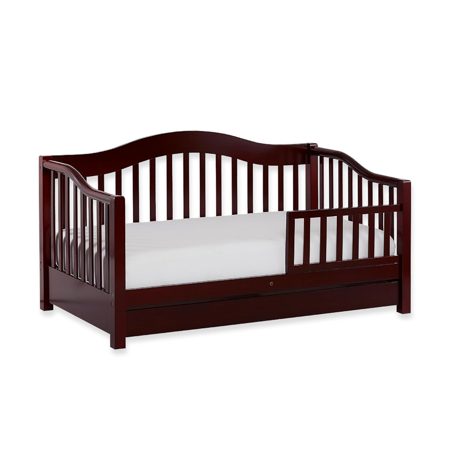 Product Description The Dream On Me Toddler Day Bed offers a perfect transition from crib to bed with its low-to-floor design. The removable safety guard rail ensures your child sleeps safely, while the solid pinewood construction offers durability and style. Available in five non-toxic finishes, this bed fits seamlessly into any nursery or toddler room. It includes a storage drawer for added convenience, keeping bed linens and essentials organized. The wooden mattress support eliminates the need for a box spring, fitting perfectly with Dream On Me non-toxic, Greenguard certified mattresses. Baby Safety Alliance certified and meeting/exceeding ASTM & CPSC standards, the Dream On Me Toddler Day Bed is a safe, sturdy, and stylish choice for your toddler. Dimensions: 54.5""L x 29""W x 28""H Max Weight Capacity: 50 lbs From the Manufacturer This handsomely designed, durable, solid wood toddler bed, looks like a day bed but is low to the floor for your toddlers convenience plus has the security of a safety rail to prevent accidental falls while sleeping. It features a roomy storage drawer underneath the bed, wooden mattress support so there is no need for a box spring and an appealing non toxic finish. This attractive day bed accommodates a Dream On Me crib mattress, sold separately. Recommended for children 18 months to 5 years old up to 50 pounds. All tools needed for easy assembly are included.