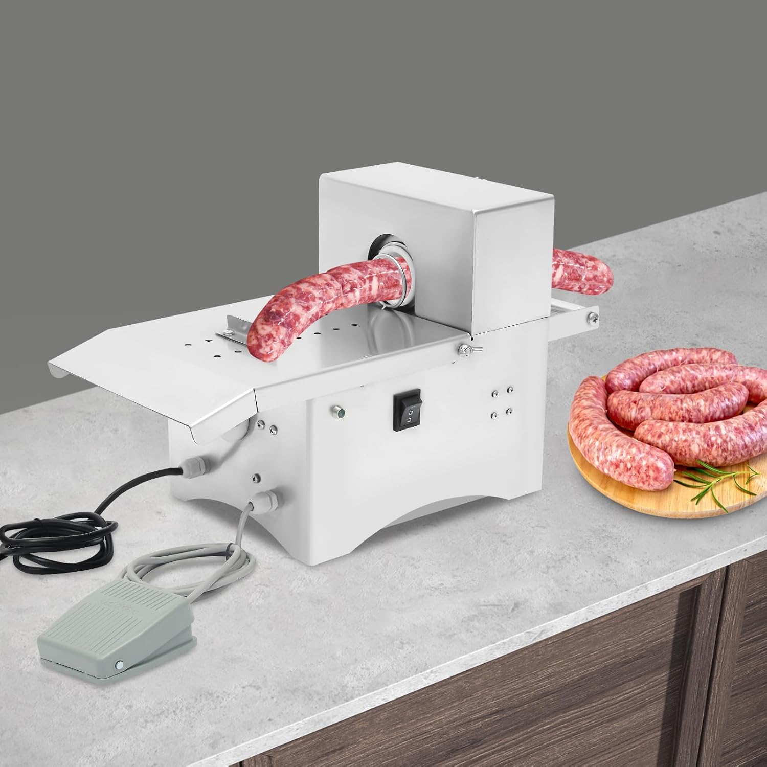 DescriptionSay hello to easy sausage-knotting with our electric tying machine! The sausage knotting machine is a game-changer for home chefs whipping up weekend treats and food stall stars serving up signature links. This clever device ties sausages efficiently, so you get gorgeous, even results every time โ with more fun and far less fuss!ApplicationThe electric sausage tying machine with pedal is suitable for sausage with a diameter of less than 1.97 inches. This sausage tying machine is ideal for meat processing plants, small-scale sausage workshops, home kitchens, delicatessens, etc.SpecificationColor: SilverStyle: ModernMaterial: Stainless SteelProcess: WeldingMount Type: TabletopPlug Type: US StandardInput Voltage: 110VOutput Voltage: 24VPower: 200WOperation Method: Manual/PedalSuitable Sausage Diameter: <5cm/1.97inAdjustable Knotting Length: 3-30cm/1.18-11.81inProduct Size: 45*21*26cm/17.72*8.27*10.24inPackage Size: 50*35*34cm/19.69*13.78*13.39inGross Weight: 12kg/26.46lbsNet Weight: 11.4kg/25.13lbsPackage Included 1* Electric Sausage Tying Machine1 Roll* Thread1* English ManualNotes1.Please check the product size carefully before purchasing.2.Please read the manual carefully before use and pay particular attention to the safety precautions.