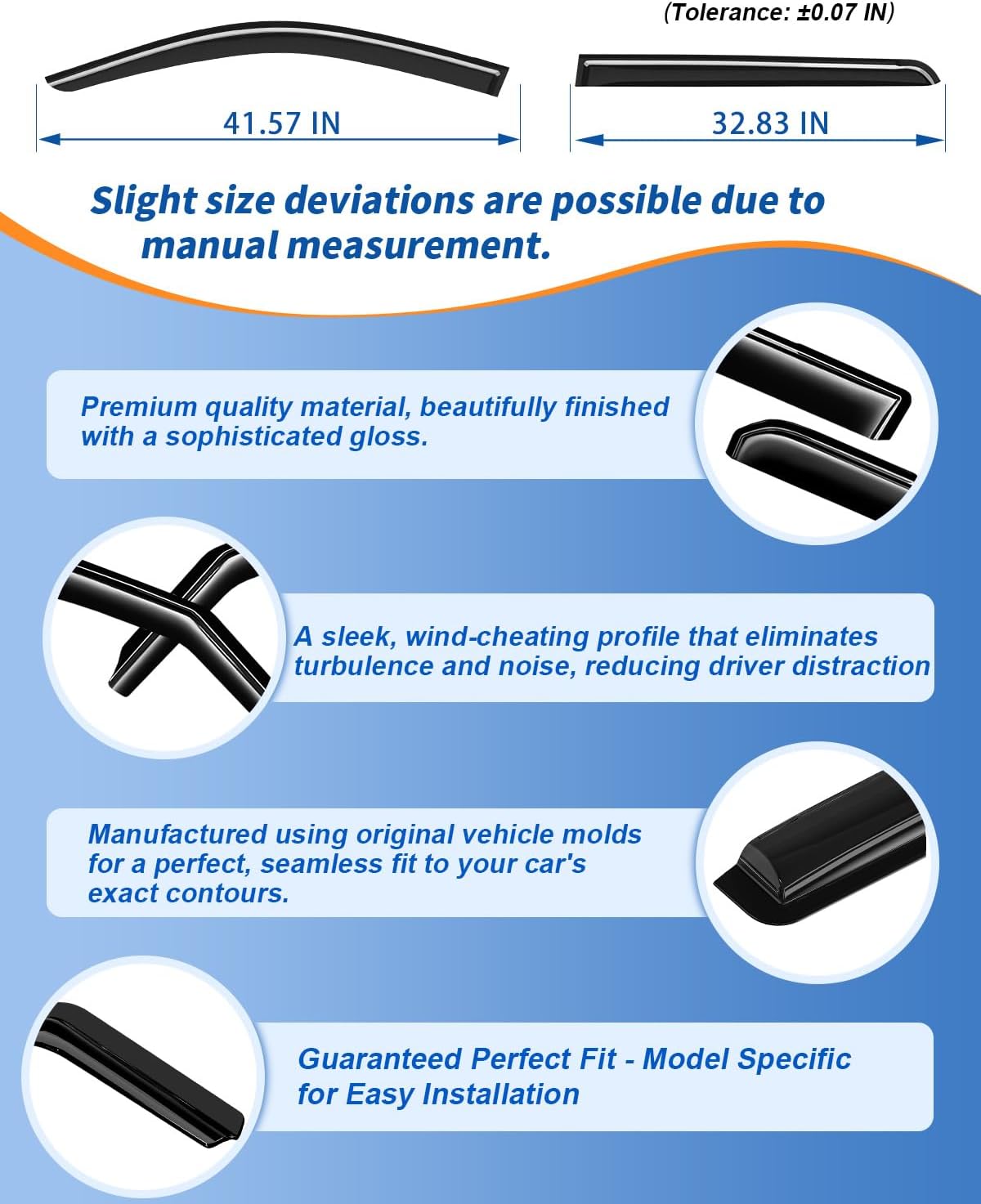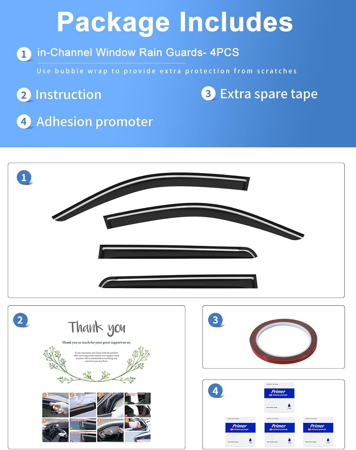 The CZShiYue Tape-on window vent visors rain guards are compatible with Honda Pilot 2023-2026 LX Sport EX-L TrailSport Touring Elite. If you are unsure about your trim, please contact us for instant verification – avoid costly misfit returns!Our rain deflectors are made from upgraded impact-resistant Polycarbonate (PC) and designed for extreme durability. They offer superior durability and exceptional strength compared to standard deflectors, withstanding daily use without cracking or warping. Compared to ordinary window rain guards, our advanced formula provides unmatched strength—ensuring reliable, long-lasting performance you can count on.Ditch complicated tools and mechanic fees! Our pure in-channel design with auxiliary adhesive strips enables hassle-free setup in four steps.Firstly, thoroughly wipe window channels with included adhesive promoter.Secondly, tear off the tape from both ends and gently flex the shatterproof visor into the track (safe to bend!).Thirdly, use the installation tool to firmly press the product into the designated position and secure it with the snap fastener.Forthly,close the window intermittently to ensure the rain guard properly seats flush with the window channel.Pro Tip: Keep windows fully closed for 72 hours post-installation and avoid water exposure (car washes/rain) for 24 hours – ensuring industrial adhesive cures into an unshakable bond. No more highway ejections or wind roar!