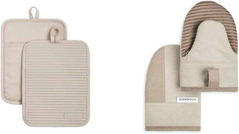 KitchenAid Ribbed Soft Silicone Water Resistant Pot Holder Set, Milkshake , 2 Piece SetPerform your kitchen tasks safely with the Kitchen Aid Ribbed Soft Silicone 2-Piece Pot Holder Set. Made of waterproof silicone on one side and durable cotton on the other side for additional shield from the heat. Featuring a pocket with polyester lining for comfort and insulation. Each pot holder measures 7 inches wide by 9 inches long. They are heat resistant up to 500 degrees Fahrenheit. Coordinate these pot holders with coordinating Kitchen Aid Ribbed Soft Silicone Oven Mitts for a complete set.KitchenAid Beacon Non-Slip Oven Mitt Set, Milkshake/Beige, 2 Piece SetShield your hands from the heat and burns with the Kitchen Aid Beacon 2-Piece Oven Mitt Set. Made of heavy-duty cotton with polyester lining that offers comfort and insulation. This set includes two mini oven mitts that each measure 5.75 inches wide by 13 inches long for easy on and off use. These mitts are heat resistant with clear printed silicone to ensure a more firm and secure grip. Featuring a convenient hanging loop for display or easy storage.