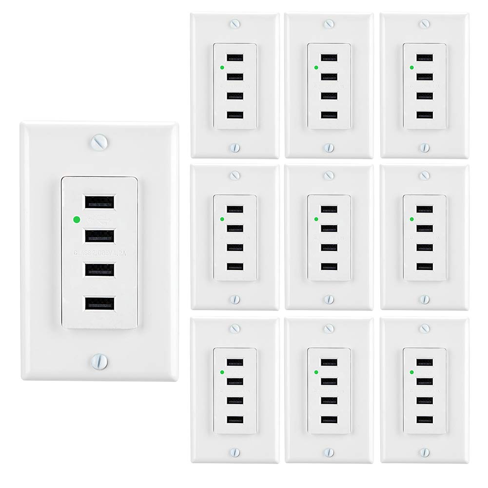 SpecificationInput Voltage:125VAC-230VACUSB Rating:2 USB ports with total 4.2 AMP 5VDCWire Terminal: #14-#12 AWGUSB Compatibility: USB 1.1/2.0/3.0 Devices, Including Apple products and Samsung productsStrip Length: 0.5 inch (HOT and Blanc holes)FeaturesHigh speed 4 USB port charger, Smart-intelligent identification chip, automatic identify the charging current that the devices required.Retardant USB interface, providing 5,000,000 times connected equipment warranty.With screwless wallplate and standard wallplate together meet your different needs.Application Site?Cafes ?Offices ?Labs ?Kitchens ?Bedrooms ?Meeting rooms ?Hotel schools ?WorkstationsCompatibilityThe duplex 4 USB charge/Tamper Resistant Outlet is compatible with a wide range of electronic devices including, but no limited to be ipad, phone series, samsung devices, digital cameras,bluetooth headsets and etc.Common problemQ: Is this an outdoor rated outlet?A: This outlet is not waterproof, so you'd better install it indoors.Q: Does it come with the wallplate?A: Each usb receptacle with two type free wallplates, one is standard wallplate with 2 screws, another is screwless wallplate.