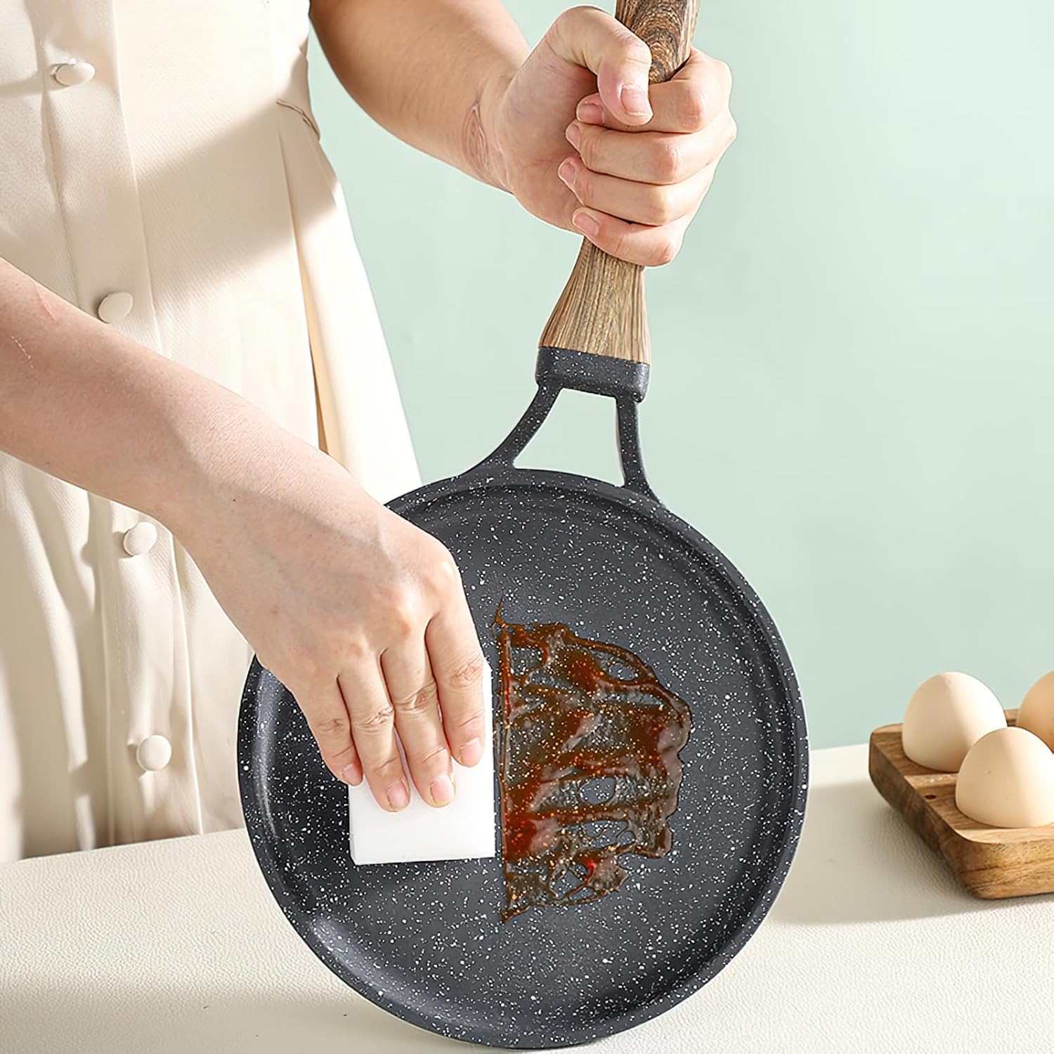 This Maifan stone flat-bottomed frying pan is designed to elevate your cooking experience with its advanced multi-layered construction. The pan features a specialized Maifan stone coating that provides excellent non-stick performance, making it ideal for preparing delicate dishes like pancakes, crepes, cake layers, and rolled desserts. The flat bottom design ensures even heat distribution across the cooking surface, preventing hot spots and allowing for consistent results every time. The multi-layered construction enhances durability and heat retention, while the non-stick surface makes cleanup effortless and requires minimal oil for healthier cooking. Whether you're flipping fluffy pancakes for breakfast, creating thin crepe layers, or preparing intricate rolled cakes, this versatile frying pan handles it all with ease. The smooth cooking surface prevents food from sticking, ensuring your delicate creations release perfectly intact. This pan is perfect for both everyday cooking and special occasions when you want to impress with beautifully prepared dishes.