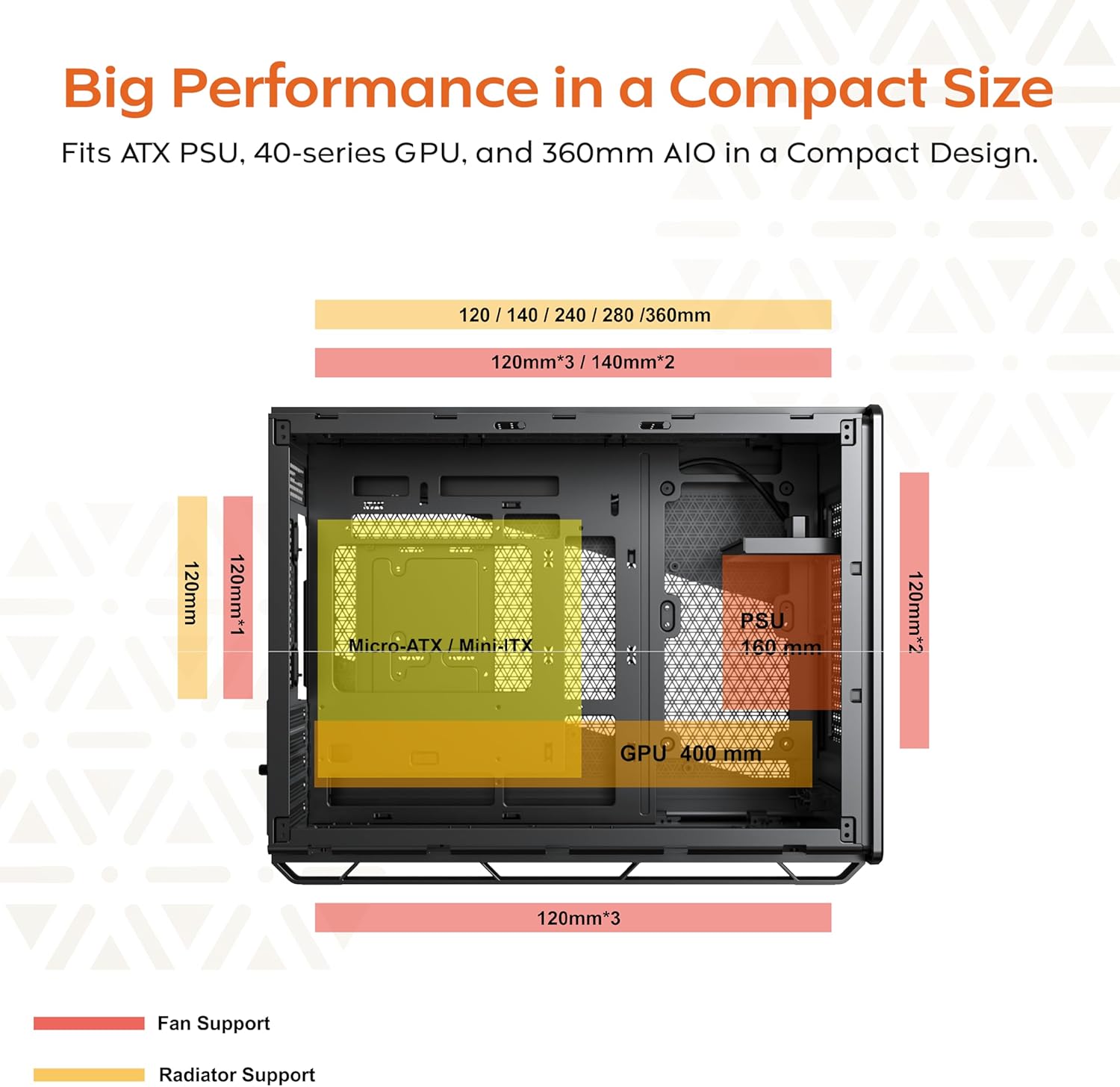 | Compatible Devices | Micro-ATX/Mini-ITX motherboards, ATX PSU, RTX 40 Series GPUs, 360mm AIO cooling |