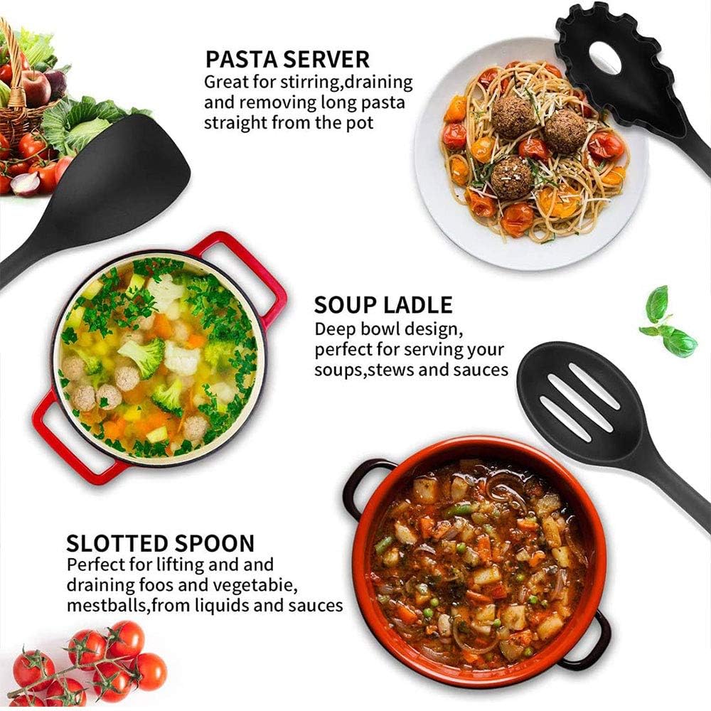 Features: 100% brand new and high quality. Carefully select silicone, stainless steel, and frosted silicone to protect your hands. Stainless steel is strong and durable. This complete set of cooking utensils covers all your kitchen needs from mixing contents in a bowl to cutting vegetables for cooking. The kitchen utensils are ergonomically designed for ease of use. The kitchenware have perfectly shaped heads for efficient and precise performance. Additionally, there is a hanging loop on the end of the utensils for easy carriage and storage. Adopt innovative technology that allows the utensils to withstand temperatures up to 446°F(230°C). Soft silicone won't scratch your expensive non-stick cookware, pots and pans.They simply won't discolor, warp, melt or chip like your typical nylon or wooden spatulas. Specifications: Material: stainless steel + silicone Colour:black Package Includes: 10 Piece kitchen Utensil Sets
