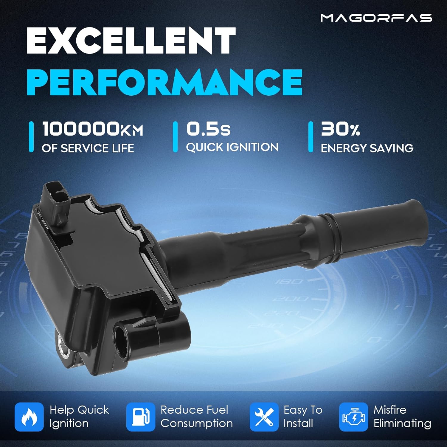 Magorfas Ignition Coils--No more stuttering, and quicker start off!100000km of service life0.5s quick ignition30% energy savingCompatible with Toyota:Fit for 4Runner 1996-2002 3.4LFit for T100 1995-1998 3.4LFit for Tacoma 1995-2004 3.4LFit for Tundra 2000-2004 3.4LPackage Includes:3 * Black Ignition Coils3 * Ignition Wires6 * Spark PlugsReplaces for:C1041, E589, 5c1308, E679, 52-1519, Ic223, 88921336, 88921337, Uf-156, 90919-02212 All Magorfas products provide 12-month service.Please check your vehicle model according to the Amazon model list to avoid wrong purchases and returns. Remember to prevent putting the ignition coils in a hot or wet environment.
