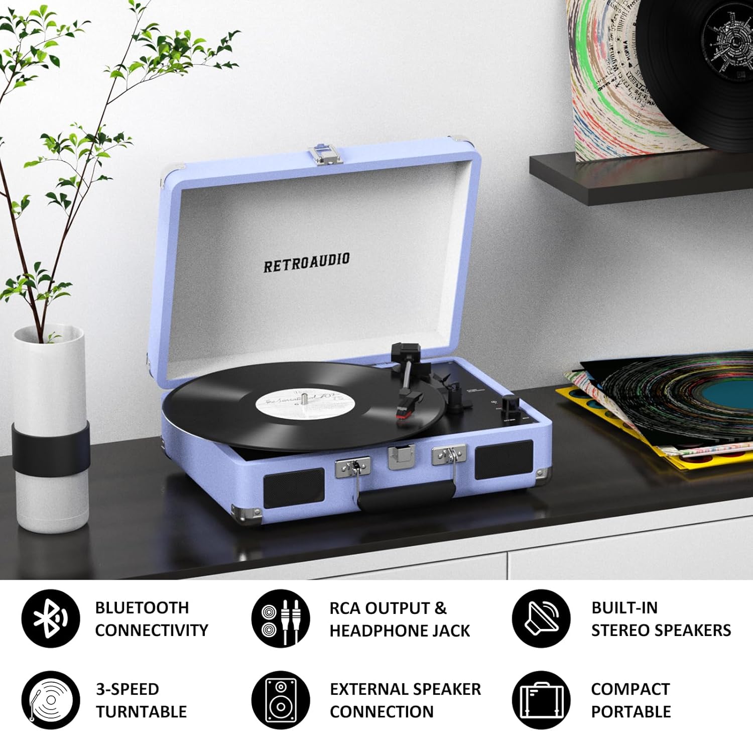 | Additional Features | Bluetooth Reception and Playback, 3-Speed Vinyl Player for 3-Size, headphone jack, RCA output to other speaker systems, 2 Built-in stereo speakers, Built In Speaker, Portable Suitcase Design |