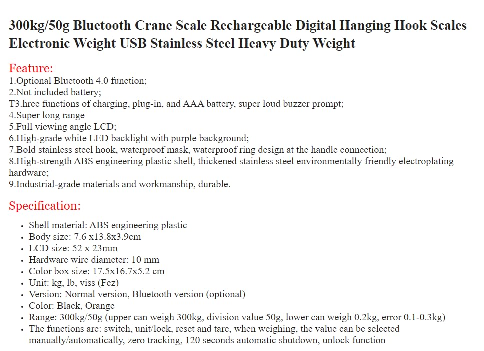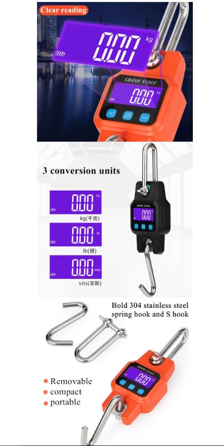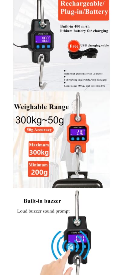 WH-C06 Portable Hanging Scale Digital Hanging Weight Hook Scale 300kg/50g Crane Scale Digital Hanging Hook Scales Electronic Weight Stainless Steel Heavy Duty Weight
